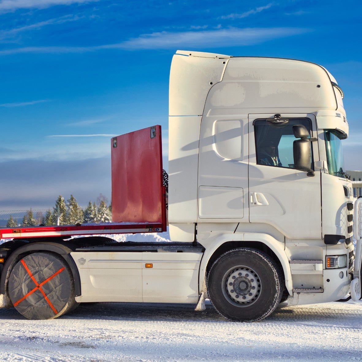 AutoSock tire sock mounted on truck wheels, driving on snow in winter landscape