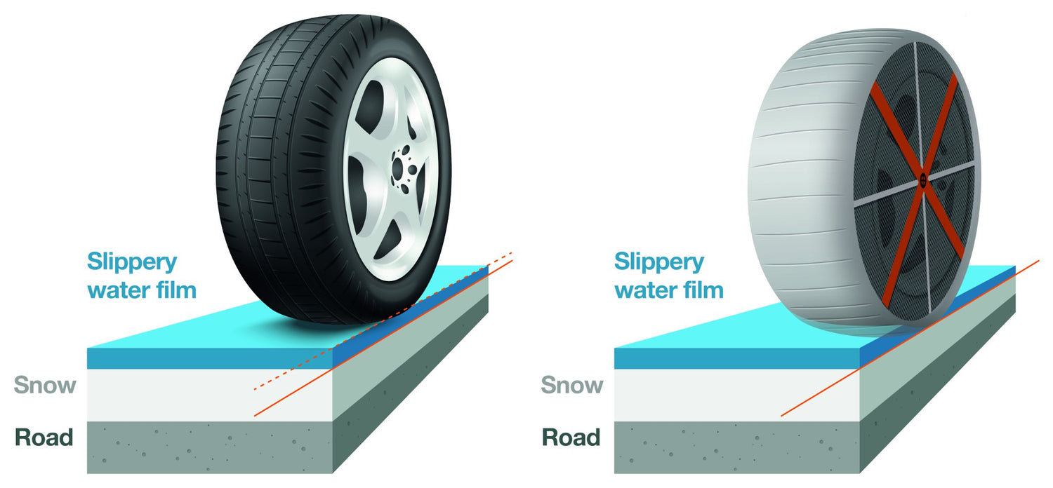 Textiles tend to stick to dry snow and ice. The arranged fibres, used for the road contact fabric of AutoSock, facilitate the textile to absorb and ‘wick away’ any water between the ground and the tyre, thereby maximizing the dry friction grip. Each thread of the road contact fabric consists of more than 100 fine high-performance fibres, which lead to a “hairy” surface of the AutoSock traction fabric. These “hairs” penetrate the slippery water film and connect the tyres directly to the surface (snow). With correct use, AutoSock becomes “hairier” and even improves performance over time.