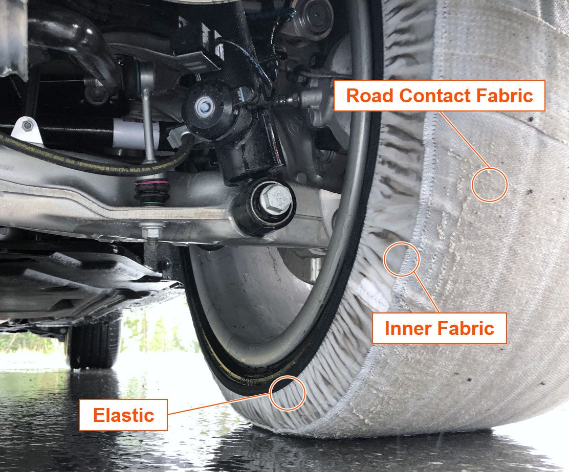 Usually used for high quality parachutes, the inner fabric holds AutoSock in position, assures proper fit on the tyre and supports the black elastic strap to reach its ideal position behind the tyre for optimal tension.